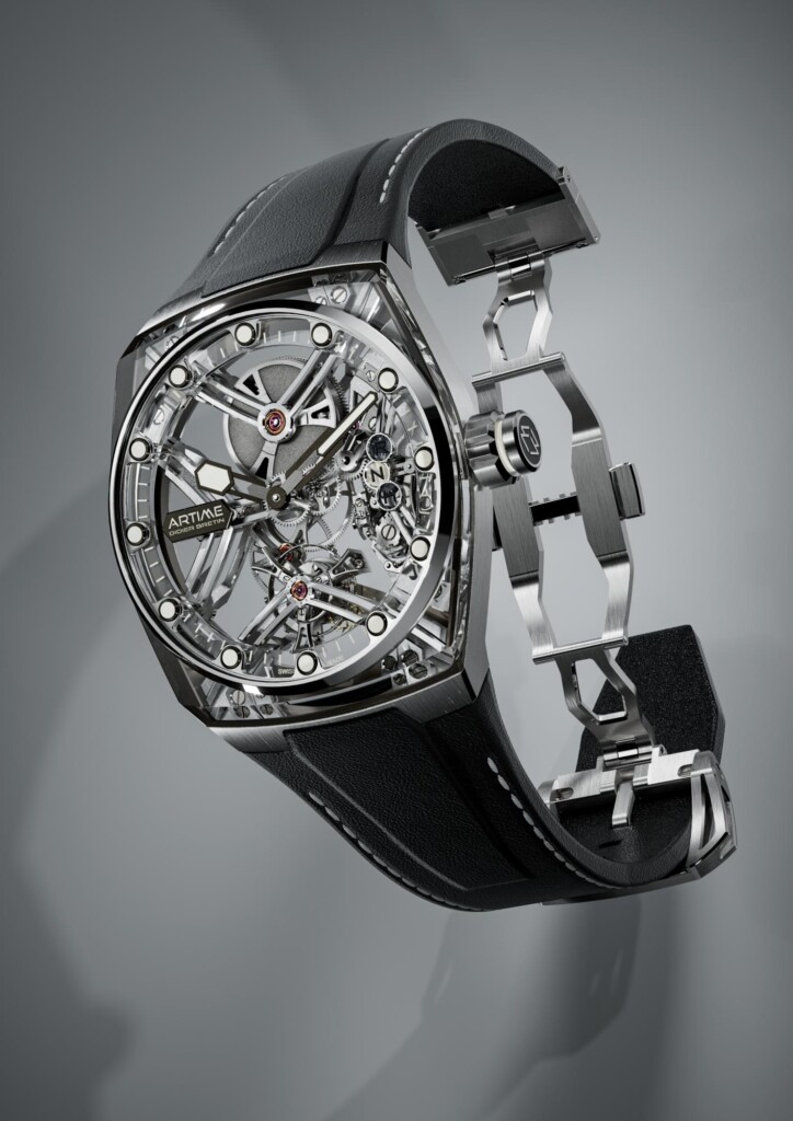 Además, está compuesto por un calibre de oro blanco de aspecto etéreo, un tourbillon con doble espiral y un selector de funciones ergonómico, íntimamente integrados en una caja en la que se mezclan el titanio y el zafiro transparente. Estas cualidades se exponen en una primera serie limitada de 20 relojes ART01 de titanio.