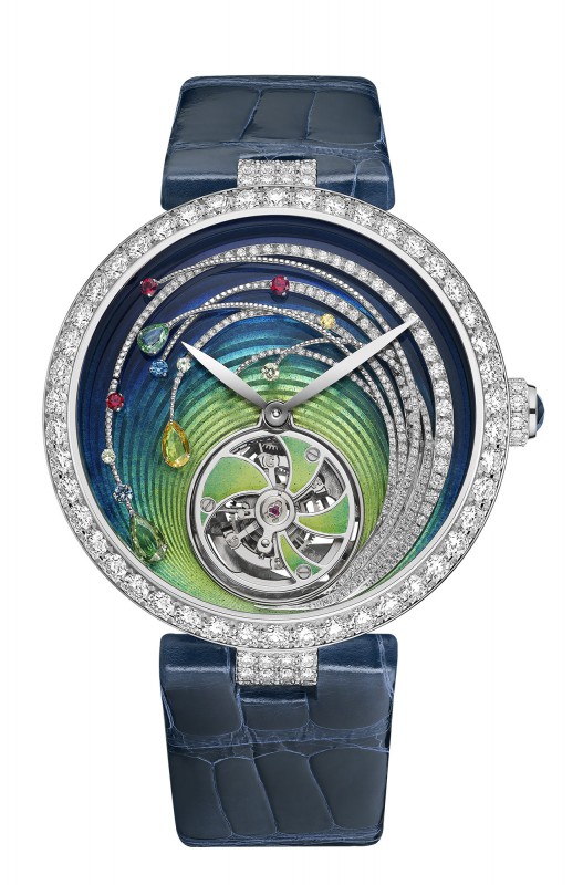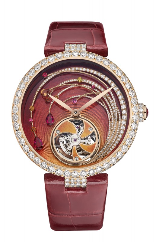 Sus diales esmaltados de grand feu, realizados con una habilidad suprema por la artista Anita Porchet, presentan un acabado en guilloché o grabado a mano. Luego, las espinelas, los granates, los zafiros, los rubíes y las turmalinas se colocan al final de las espirales de oro engastadas de diamantes. El más grande de ellos, en forma de pera, está montado en trembleuse para un efecto vibrante y brillante.