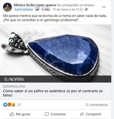 Respuesta al artículo Cómo saber si un zafiro es auténtico (o por el contrario es falso) por Jesús Ángel Ruiz Mayoral | Ante la publicación de su artículo en fecha 14 de marzo de 2021, no nos queda más que intentar esclarecer los términos de posibilidad de identificación de dicha gema.