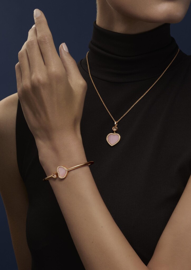 La colección Happy Hearts de la marca Chopard que, desde su lanzamiento en 2009 asocia los diamantes móviles icónicos de la Casa con el corazón, suma una nueva incorporación, el recién nacido corazón de ópalo rosa, que se presenta en un conjunto compuesto por un colgante, una pulsera, un anillo y un par de pendientes.