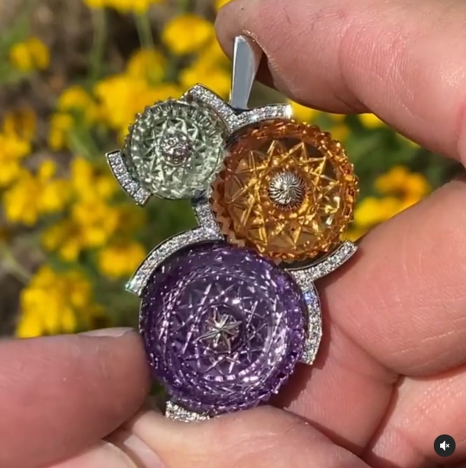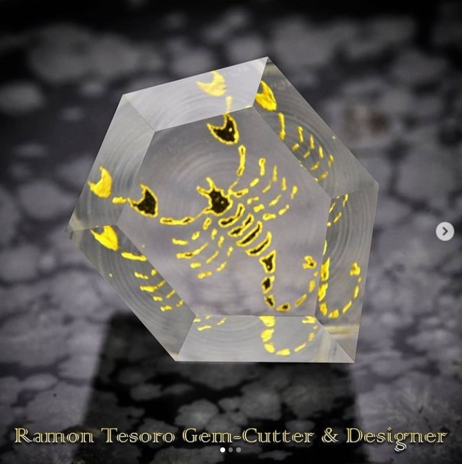 Entre sus publicaciones más recientes encontramos una particularmente sorprendente, alejada de sus trabajos más habituales. Consiste en un escorpión de oro de 24 quilates incrustado entre dos capas de cuarzo, facetado en la parte superior, y con un patrón satinado de forma circular tallado a mano en la parte inferior, que recuerda al agua, ya que el escorpión es un signo de agua. Cuando le preguntamos por este ejemplar, nos comenta: «Acabo de desarrollar la técnica. Ese era un prototipo para un proyecto que pensé para un cliente, que me pidió que facetara una turmalina rosa con un escorpión visible. La primera opción obvia fue cortar algunas facetas esmeriladas para delinear un escorpión, pero quería probar algo nuevo”. Nos explica que prefiere mantener en secreto los detalles de esta técnica, el proceso es largo y requiere varios pasos, y quiere perfeccionarlo todavía.