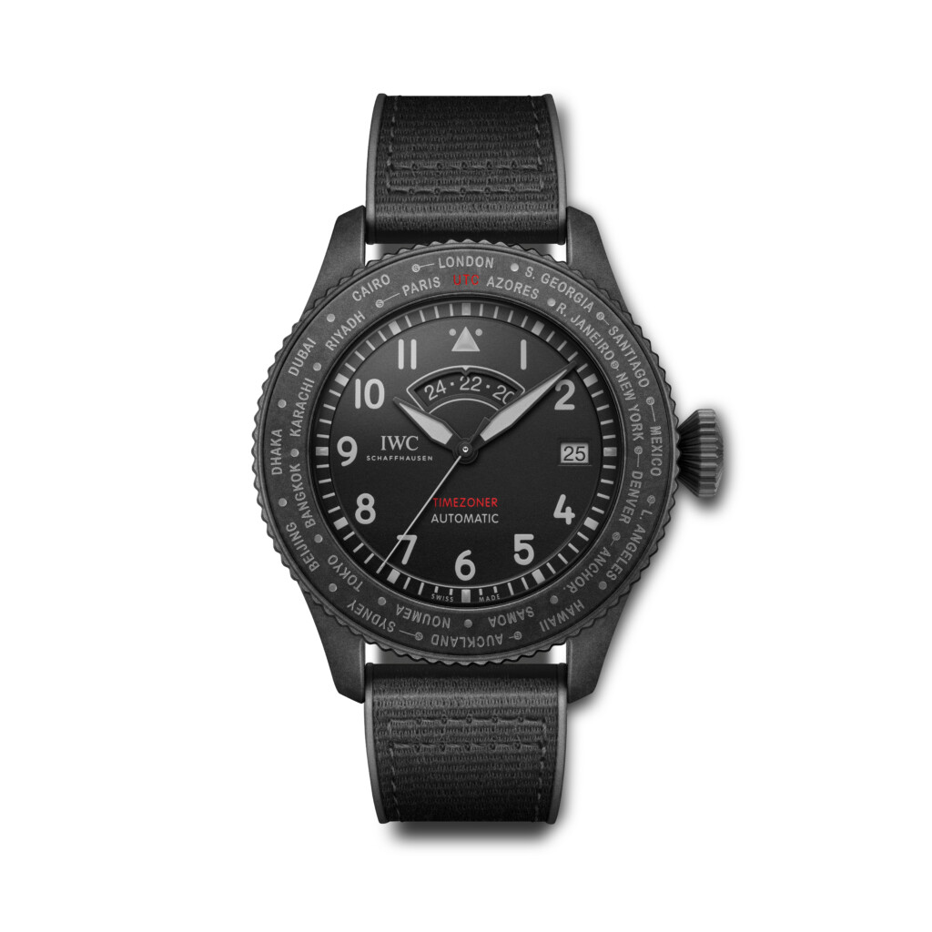El Reloj de Aviador Timezoner TOP GUN Ceratanium (Ref. IW395505) es el primer modelo TOP GUN con una complicación Timezoner®. Con este mecanismo, solo es necesario presionar y rotar el bisel para establecer un huso horario diferente. En la rotación, la aguja de las horas, el indicador de 24 horas y la fecha se mueven en saltos de una hora hacia adelante o hacia atrás. Además, también funciona cuando se pasa a otro día. Y todo sin perder un solo segundo. La caja está fabricada en Ceratanium®, y su anillo de ciudades, en cerámica. Este anillo contiene el nombre de 24 ciudades, cada una en representación de su huso horario internacional. Los números aparecen impresos en gris sobre la esfera, mientras que los números 12, 3, 6 y 9 van revestidos de un material luminiscente. Su diseño técnico negro azabache se ve completado con un fondo de caja de cristal de zafiro y una correa de caucho negra con incrustaciones textiles. El calibre 82760 de manufactura IWC cuenta con una cuerda Pellaton con componentes cerámicos y ofrece una reserva de marcha de 60 horas en su muelle principal. La producción anual del Reloj de Aviador Timezoner TOP GUN Ceratanium estará limitada a 500 ejemplares.