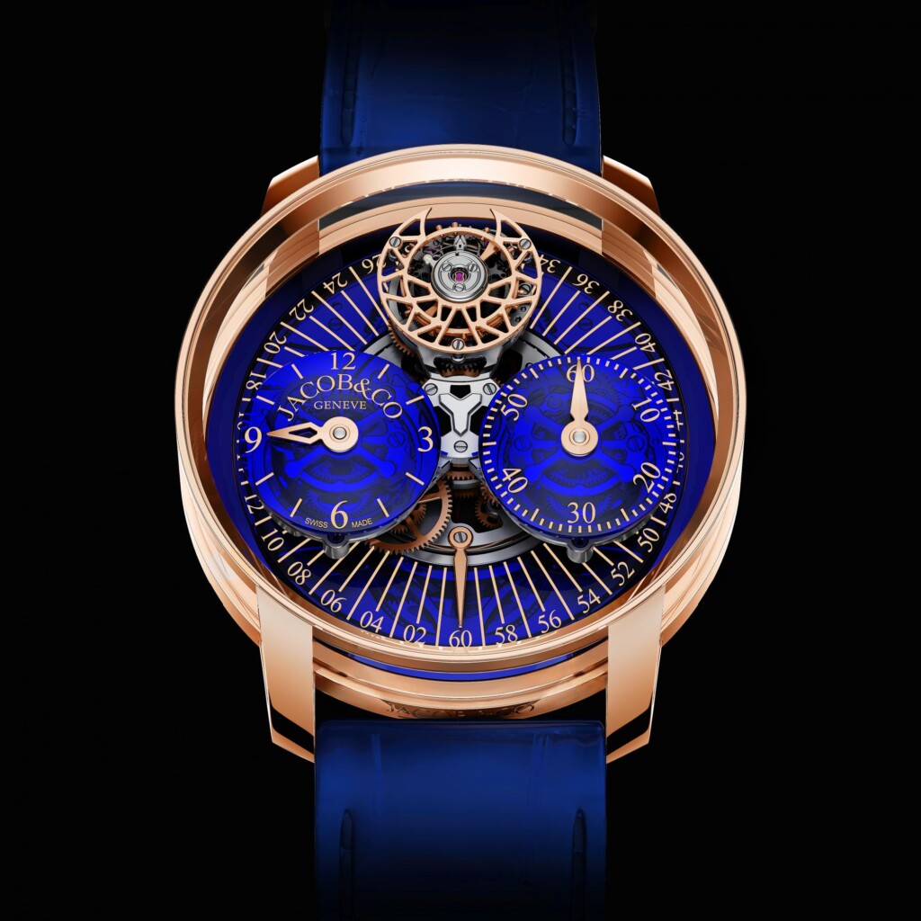 Con sus tipografías clásicas y agujas doradas, completan este homenaje a la relojería de alta precisión. Combinando una de las complicaciones más clásicas con su arquitectura característica de astronomía, Jacob & Co. revoluciona la exhibición del regulador y agrega un rendimiento relojero «inspirado en lo imposible».