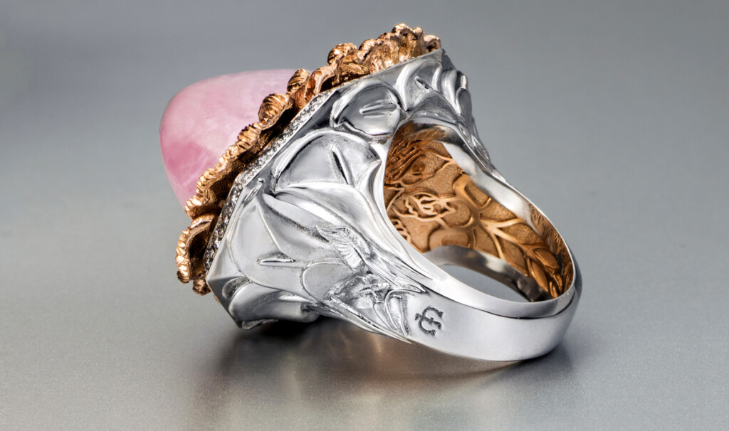 El cuerpo del anillo ha sido elaborado con oro blanco de 18 quilates, con un forro de oro rosa de 18 quilates. En la parte superior se emplaza una corona de 42 diamantes de 1,9 mm, sobre los que descansan hojas elaboradas en oro rosa de 18 quilates que rodean una turmalina de Afganistán con una llamativa talla.