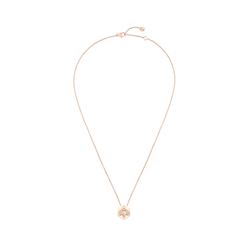 Volviendo a los orígenes creativos de la colección Bee My Love, este nuevo medallón de oro rosa con pavé de diamantes tiene como emblema la abeja, un símbolo imperial presente en las creaciones de la Maison desde principios del siglo XIX. Situado en un panal gráfico, este motivo naturalista posee una estética una inesperada estética reducida, lo que convierte a esta nueva creación en un icono contemporáneo, fácilmente mezclable con las demás piezas estilizadas de la colección. Llevado como un precioso amuleto, es la joya perfecta para ofrecer a otro o a uno mismo, iluminando las oscuras profundidades del invierno.