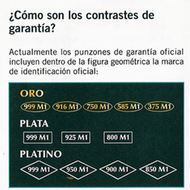 - Oro: 999, 916, 750, 585 y 375 milésimas