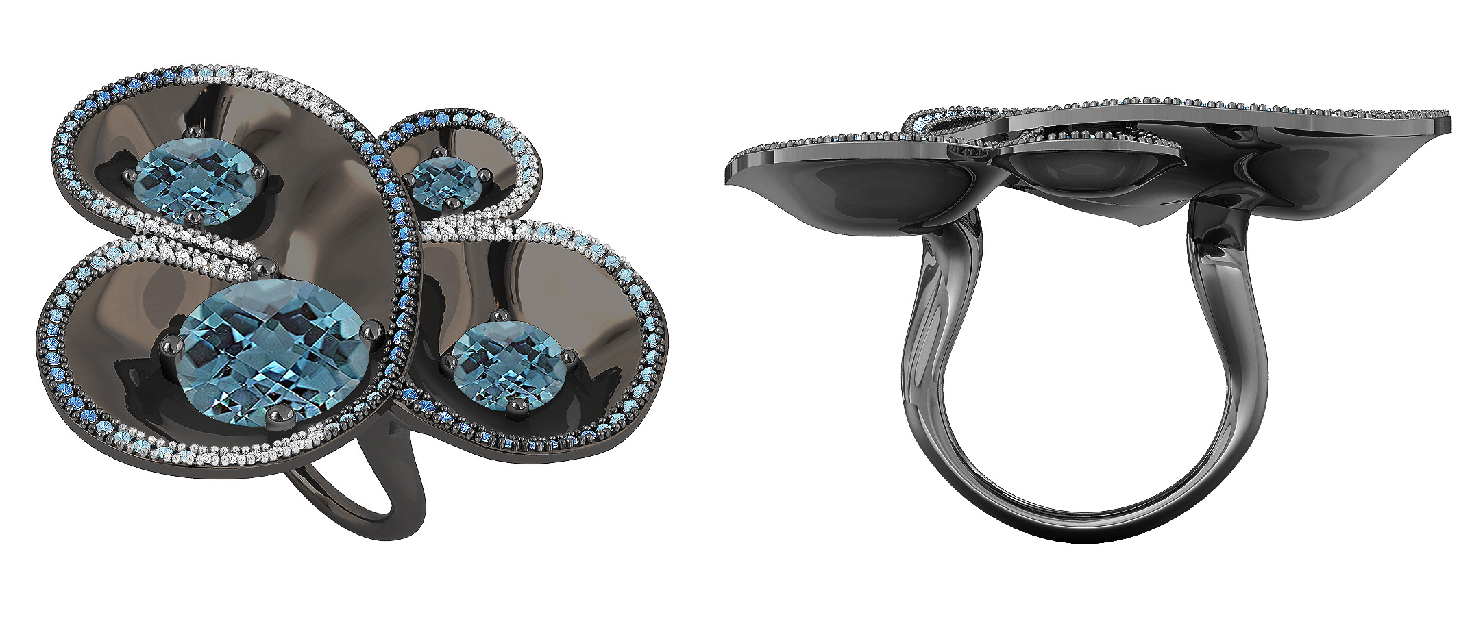 Sortija inspirada en el Universo, en oro blanco con baño de rodio negro y un peso de 25 a 30 gr. Las gemas principales son cuatro topacios azules 98 zafiros de varios tonos de azul y 39 diamantes blancos en engaste de cuajo. Técnicas tradicionales de joyería, impresión 3D y engastado.