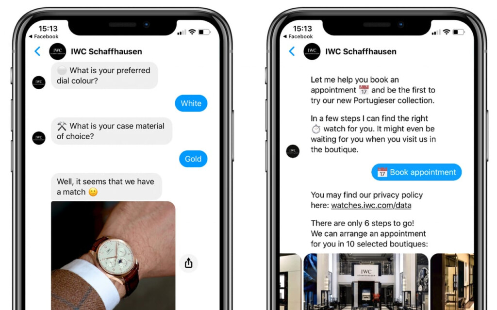 La firma alemana IWC ha trabajado con el equipo Messenger de Facebook y Creative Shop para crear una aplicación que permita a los clientes visitar una boutique virtual y chatear con un asesor virtual a través de una aplicación Chatbot, un dispositivo basado en la Inteligencia Artificial .