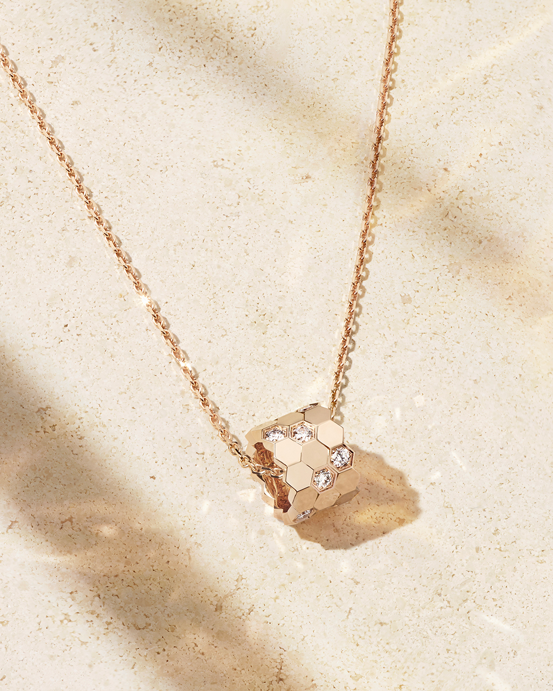 Brillando como el sol según los movimientos del portador, refleja las diferentes luces de un día de verano a través de cada una de sus celdas de oro pulido a espejo. Disponible en tres versiones -de oro rosa, de oro rosa salpicado de seis diamantes, o de oro blanco salpicado de seis diamantes- ilumina la zona del busto con su calor solar, parpadeando con mil fuegos, según la icónica firma francesa.