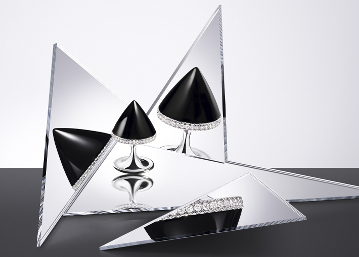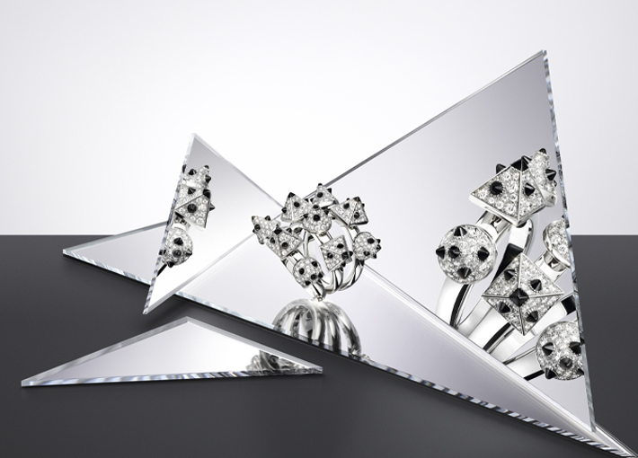 Todo se basa en la tensión extrema, en el choque de los opuestos: la geometría de las líneas y la inflación de los volúmenes. Estas dos actitudes se contraponen, y las nuevas joyas reflejan esta dualidad.