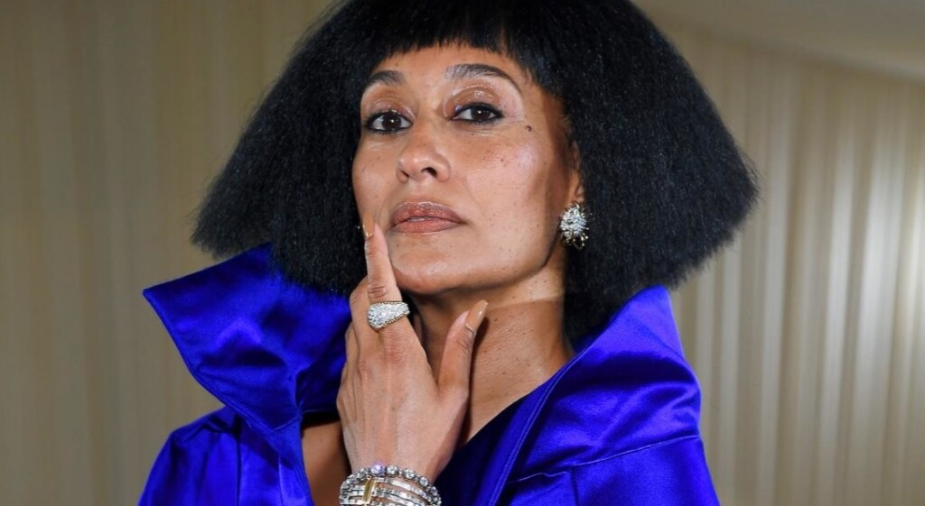La galardonada actriz Tracee Ellis Ross lucía deslumbrante con los pendientes y el anillo de Schlumberger de Tiffany & Co. junto con brazaletes de diamantes de la colección Blue Book de Tiffany & Co. para complementar su atrevido conjunto azul Balenciaga.