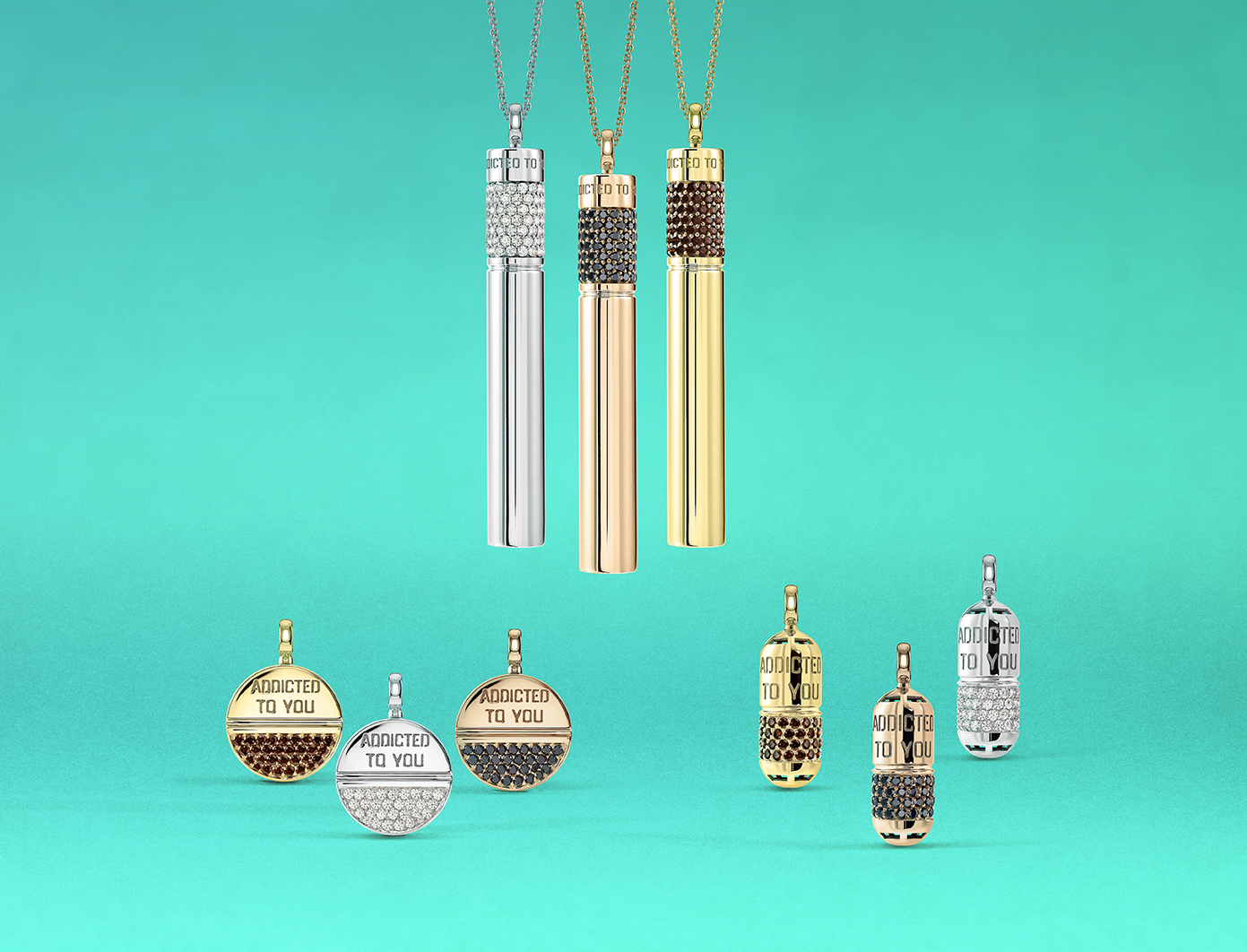 A partir de aquí, la marca debuta hoy con la colección DRUG, compuesta por tres colgantes. La adicción química se convierte en una alquimia perfecta para terapias de lujo, un alegre himno a la vida. Los modelos que componen la colección DRUG revelan un carácter lúdico y metafórico, consagrado por el provocativo grabado ADDICTED TO YOU, la firma de NESS1.