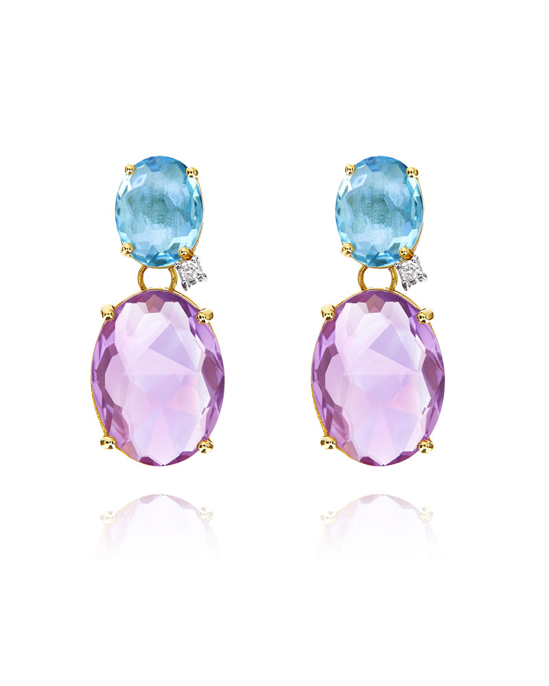 La amatista y el topacio azul se abrazan en estos aretes de oro de 18 quilates y diamantes con colores vibrantes, listos para llevar a soñar despierto.