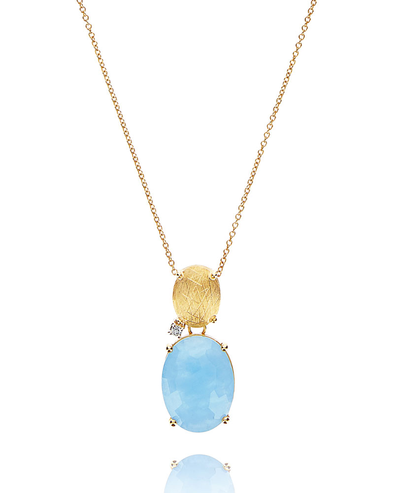Un refinado colgante de oro de 18 quilates y aguamarina lechosa coronado con un elegante detalle de diamantes. La sofisticada mano de obra en oro juega con la luz, reflejándola sugestivamente, y da la bienvenida a la piedra natural, sellando el encuentro entre la naturaleza y la artesanía.