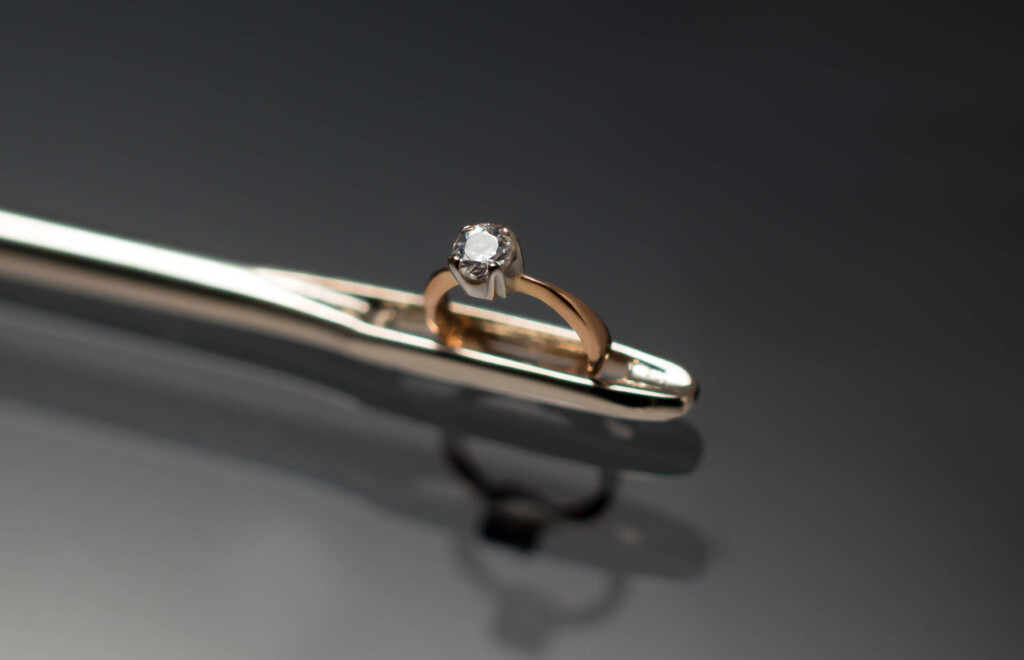 El anillo de oro blanco y rosa y diamantes creado por Vadim Kachan, un joyero de la ciudad bielorusa de Brest pesa solo 0,01 gramos. El diamante en la parte superior de este anillo de oro, que ha sido diseñado con las proporciones exactas de un anillo de solitario de tamaño completo, pesa solo 0.002 quilates y mide 0.9 mm de diámetro.