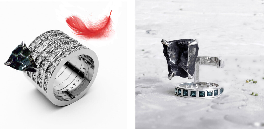 Anillo ‘Messier’ con meteorito metálico (Sikhote-Alín) y 3,20 quilates de diamantes sobre oro blanco.Más información en: www.ritesofpassage.es