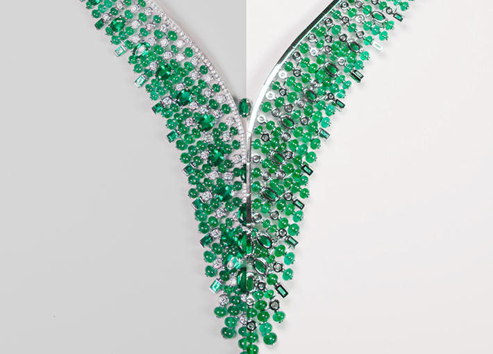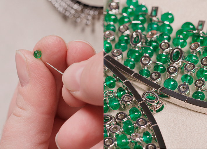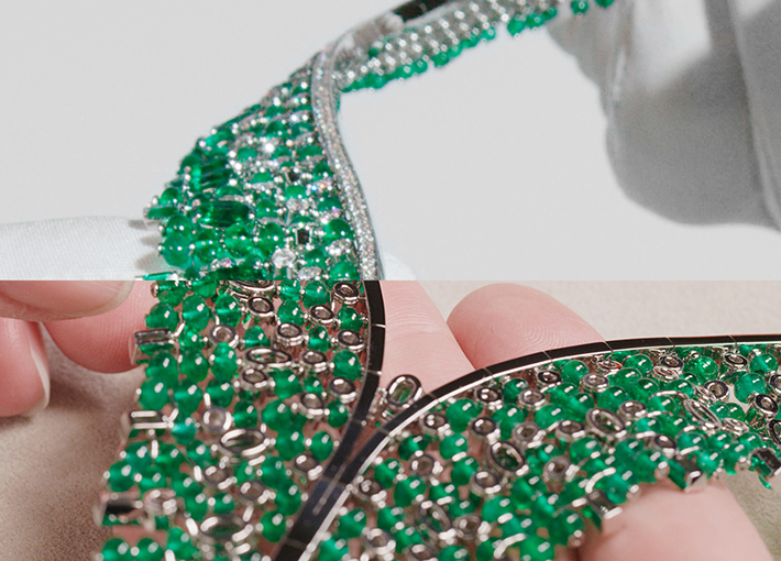 «Un tejido centelleante, un verde que irradia, vibra, brilla. Construido como una cascada de gotas de esmeralda, el collar Alaxoa revela un material vivo de una intensidad extraordinaria. Los puntos de referencia se desdibujan ante este tejido hecho de pequeñísimas cuentas de esmeralda seleccionadas por expertos gemólogos y diseñadores, esculpidas, pulidas a mano y ensartadas una a una. El resultado: más de 80 hebras sostenidas en abanico por pequeños puentes salpicados con sublimes diamantes colocados de forma dispar que acompañan cada movimiento con un brillo fugaz. En la piel, el