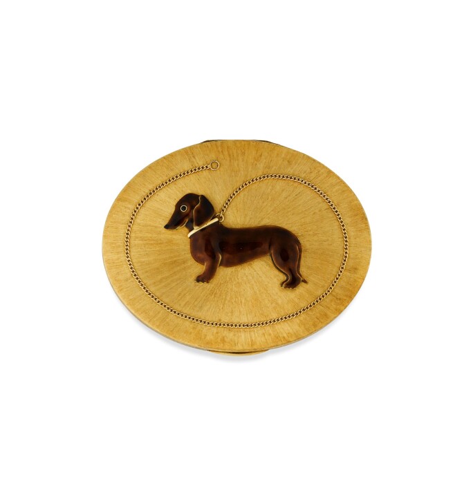 67Type: lotRENÉ BOIVINPoudrier or et émail, «Basset» | Gold and enamel powder compact ‘Basset’ESTIMATE: 5,000 – 7,000 EUR -