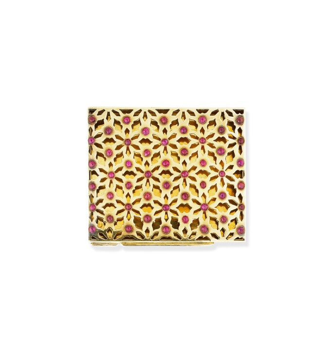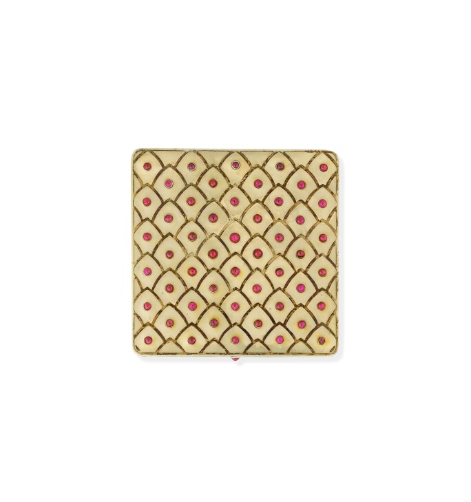 61Type: lotRENÉ BOIVINPoudrier vermeil et rubis | Silver-gilt and ruby powder compactESTIMATE: 3,000 – 5,000 EUR -