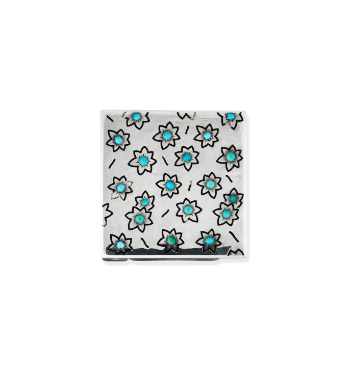 sesenta y cincoTipo: loteRENÉ BOIVINPoudrier argent, émail et turquoises | Silver, enamel and turquoise powder compactESTIMATE: 2,600 – 3,500 EUR -