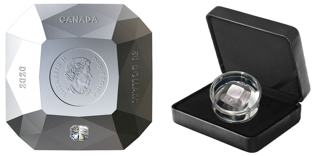 La moneda en plata pura de tres onzas (con un valor nominal de 50 dólares canadienses) tenía un coste de unos 1.000 euros y además de su pintoresca forma contaba con otra peculiaridad: Lleva engastado un diamante de 0.20 quilates manufacturado por Forevermark (filial de De Beers), procedente de la mina Víctor, una explotación de los territorios del noroeste canadiense que el grupo minero abandonó en 2019.