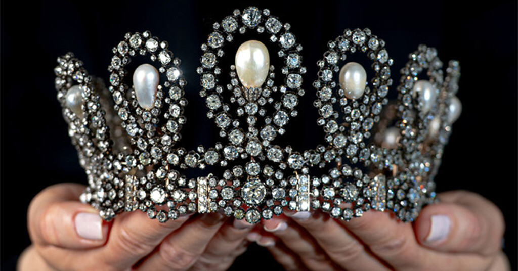 La tiara cuenta con 11 perlas naturales y con entre 150 y 170 quilates de diamantes en formas de cojín, redonda antigua y otras tallas especiales, con un colores entre J-K, y claridad SI-I. La pieza no tiene autor acreditado pero algunas fuentes sitúan al taller Musy e Figli de Turín como probables orfebres de la pieza.