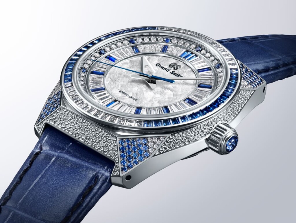 La caja misma, reluciente con tonos blancos, está forjada en frío a partir de Platino 950 y pulida minuciosamente con la tecnica Zaratsu, una característica distintiva de los relojes Grand Seiko. Diamantes y cuatro tonos diferentes de zafiros azules han sido cuidadosamente seleccionados y engastados por hábiles artesanos en las asas